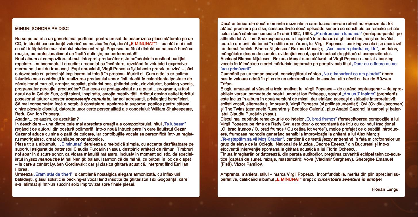 „Nu se putea afla un generic mai pertinent pentru un set de unsprezece piese alăturate pe un CD, în ideală concordanță valorică cu muzica însăși, decât „E MINUNAT”! – cu atât mai mult cu cât înfăptuirilr muzicianului plurivalent Virgil Popescu au făcut dintotdeauna casă bună cu reușita, cu profesionalismul de înaltă definiție, cu performanța!!!